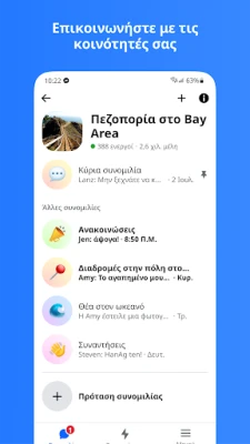 Η επικοινωνία στο Messenger επεκτείνεται πέρα από τον στενό σας κύκλο, επιτρέποντάς σας να συνδεθείτε με κοινότητες – από το σχολείο και τη γειτονιά σας μέχρι ομάδες με κοινά ενδιαφέροντα. Ενισχύστε τις σχέσεις σας και δημιουργήστε νέες με ευκολία, χρησιμοποιώντας κωδικούς QR για άμεση προσθήκη επαφών. Για τις πιο σημαντικές πληροφορίες, το Messenger σας δίνει τη δυνατότητα να μοιραστείτε μεγάλα αρχεία έως 100MB, όπως έγγραφα Word, PDF και Excel, απευθείας στις συνομιλίες σας. Ξεχάσατε κάτι ή στείλατε ένα μήνυμα βιαστικά; Επεξεργαστείτε ή ακυρώστε το εντός 15 λεπτών. Επίσης, για εκείνες τις στιγμές που η ιδιωτικότητα είναι πρωταρχικής σημασίας, επιλέξτε προσωρινά μηνύματα σε κρυπτογραφημένες συνομιλίες, ρυθμίζοντας τη διάρκεια παραμονής τους. Αναδείξτε την προσωπικότητά σας με ιστορίες και σημειώσεις που εξαφανίζονται μετά από 24 ώρες, ενώ μπορείτε να προσαρμόσετε κάθε συνομιλία με θέματα, αυτοκόλλητα και GIF, κάνοντάς την μοναδικά δική σας. Συνδεθείτε επίσης με τους αγαπημένους σας δημιουργούς, συμμετέχοντας στα κανάλια τους για αυθεντικό περιεχόμενο.