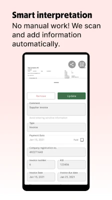 Τα ψηφιοποιημένα σας δεδομένα μπορούν να αποστέλλονται απρόσκοπτα σε κορυφαία λογιστικά συστήματα και πλατφόρμες, όπως τα Spiris, Visma Administration, Visma Fivaldi, Visma Netvisor και πολλά άλλα. Αυτό διασφαλίζει την άμεση ενσωμάτωση των πληροφοριών στα λογιστικά σας αρχεία, μειώνοντας τα λάθη και επιταχύνοντας τις διαδικασίες. Η εφαρμογή ενισχύει επίσης την έξυπνη και απλοποιημένη συνεργασία με το λογιστικό σας γραφείο, παρέχοντάς τους άμεση πρόσβαση στα ενημερωμένα σας στοιχεία και εξασφαλίζοντας μια ομαλή ροή εργασιών χωρίς καθυστερήσεις, για αποτελεσματική λογιστική υποστήριξη.